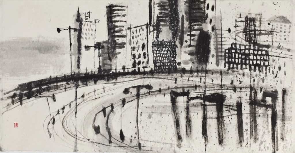 도시 빌딩숲 너머에 바다 보이다